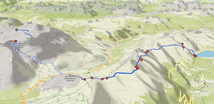 Auf dieser Etappe deiner Alpenüberquerung wanderst du von der Boèhütte zum Fedaiasee. Der Weg führt dich zunächst durch die felsige Hochebene der Sella, vorbei am Piz Boè, der mit 3.152 m der höchste Gipfel der Sellagruppe ist und eine atemberaubende 360°-Rundumsicht bietet. Anschließend steigst du über felsdurchsetzte Wiesen und Schotterfelder zum Passo Pordoi ab, wo du vielen Tagesausflüglern begegnen kannst. Ein gut ausgebauter Höhenweg führt dich über den Padonkamm mit beeindruckendem Panorama auf die Marmolata, die Königin der Dolomiten, die dich bis zum Fedaiasee begleitet. Der Fedaiasee, umgeben von imposanten Gipfeln und dem Marmolata-Gletscher, bildet das Ziel dieser Etappe.