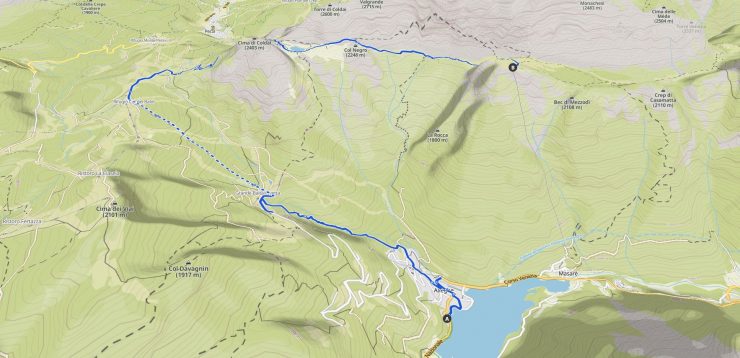- Col dei Baldi ohne Seilbahn: Diese Route führt zu Fuß über den Col dei Baldi und bietet eine mittlere Schwierigkeit für Wanderer, die auf die Seilbahn verzichten möchten. Planungsvariante 20a.