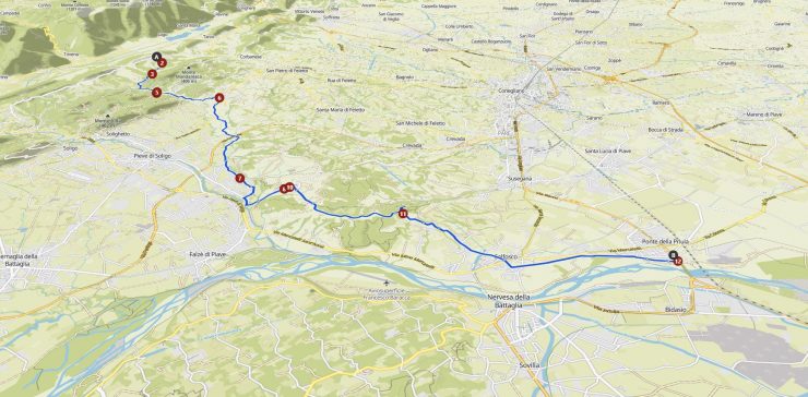 Die Wanderung beginnt in Arfanta, einem kleinen Dorf im Herzen des Prosecco-Gebiets. Der Abstieg führt durch Wälder und Weinberge und bietet viele Gelegenheiten für Pausen und zum Genießen der Landschaft. Nach einem Abstecher zur historischen Wassermühle Molinetto della Croda geht es weiter durch die Dörfer Refrontolo und Barbisano bis zur Ponte della Priula.