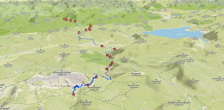 Auf der vierten Etappe deiner Alpenüberquerung wanderst du von der Tutzinger Hütte nach Hinterriß und überquerst dabei die erste Landesgrenze von Deutschland nach Österreich. Die Etappe beginnt mit einem Aufstieg in Richtung Benediktenwand. Für konditionsstarke Wanderer lohnt sich ein früher Aufbruch für einen Abstecher auf den Gipfel der Benediktenwand, einen fantastischen Aussichtspunkt mit 360°-Panorama. Nach dem ersten Aufstieg erfolgt der Abstieg durch den Wald nach Jachenau, ein malerisches Dorf mit tollen Wirtshäusern, die zu einer Mittagsrast einladen. Hinter Jachenau steigt der Weg wieder an und führt über Forstwege und an zwei Almen vorbei zum Rißsattel. Vom bewaldeten Sattel, der einen tollen Blick auf den Rißbach bietet, gelangt man steil bergab nach Vorderriß und weiter nach Hinterriß.
